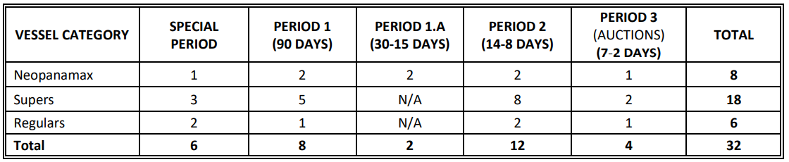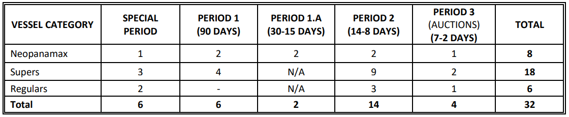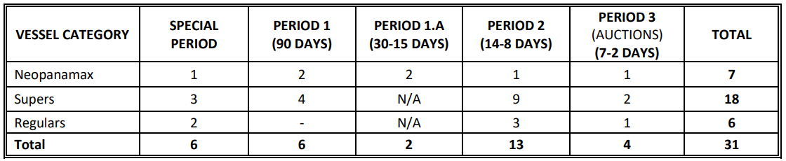 The following tables summarize the slot distribution per Booking Period for the Panamax and