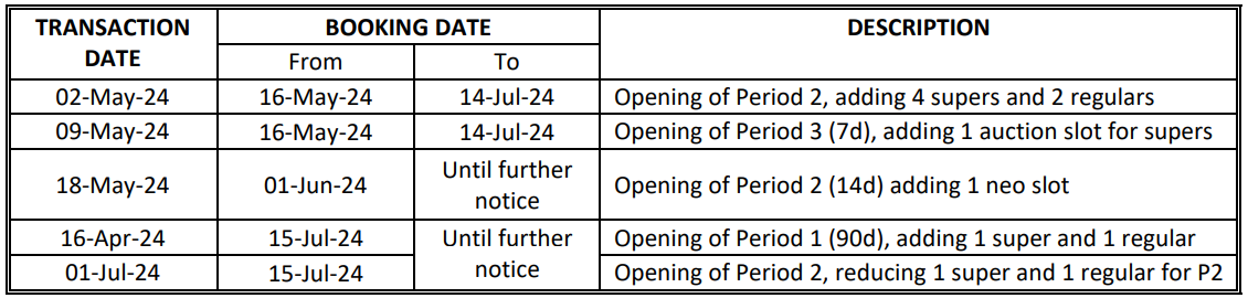 The following table summarizes the competition dates for the new slot distribution for booking dates beginning May 16, 2024: